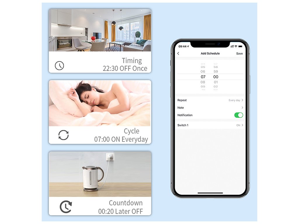 Zásuvku můžeme nastavit tak, aby se zapínala a vypínala v libovolný čas. Navíc můžeme snadno ovládat hlasem díky spolupráci s hlasovými asistenty, jako jsou Alexa a Google Assistant.