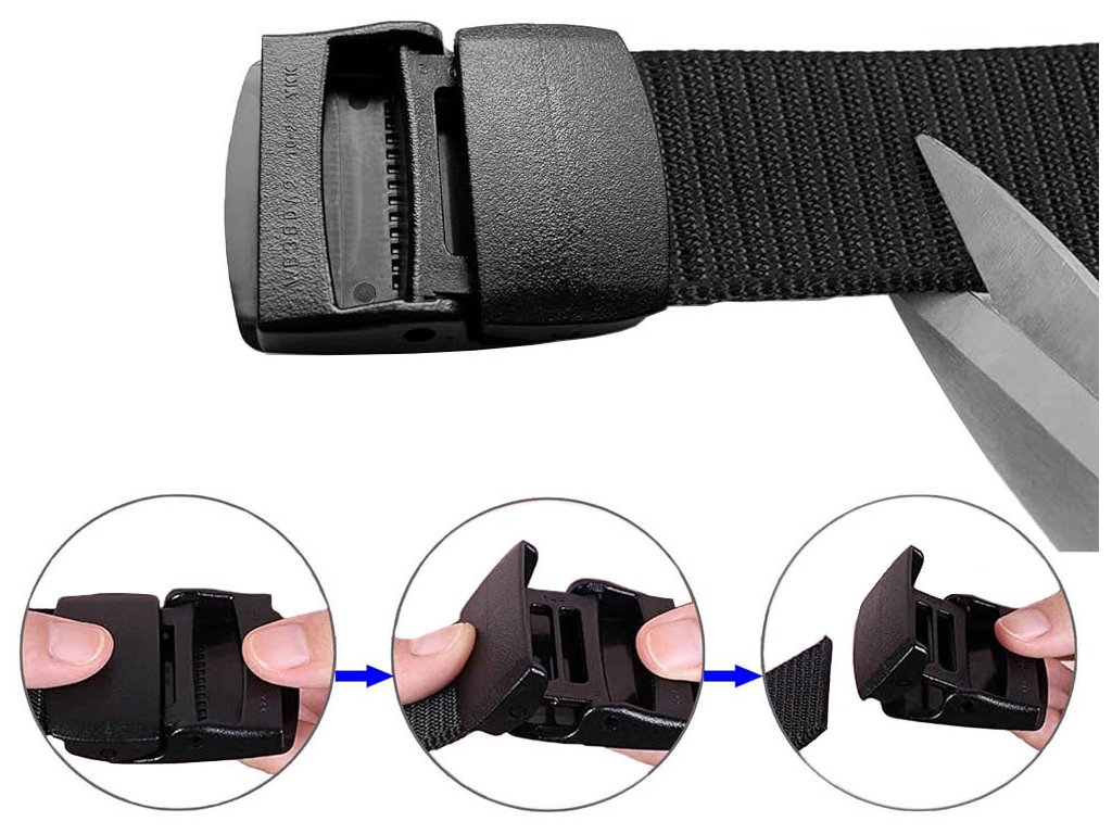 Praktický opasek s plastovou sponou. Bez kovových částí.