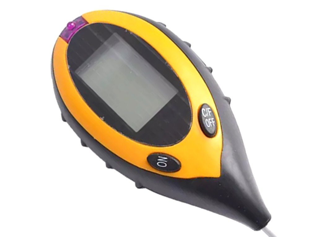 Elektronický měřič kyselosti půdy. Umožňuje určit potřebu vápnění a doporučené dávky vápníku pro regulaci pH půdy. Přístroj umožňuje provádět další měření, jako je vlhkost půdy, teplota a sluneční záření. Výsledky měření se zobrazují na přehledném LCD displeji s podsvícením. Dlouhá sonda umožňuje měření v hloubce až 20 cm. Zařízení je napájeno 9V baterií (nevyžaduje přístup k elektřině) a jeho kompaktní rozměry umožňují jeho přenášení kamkoli.