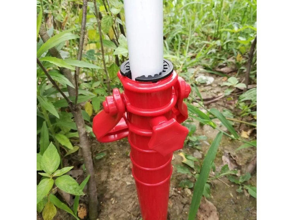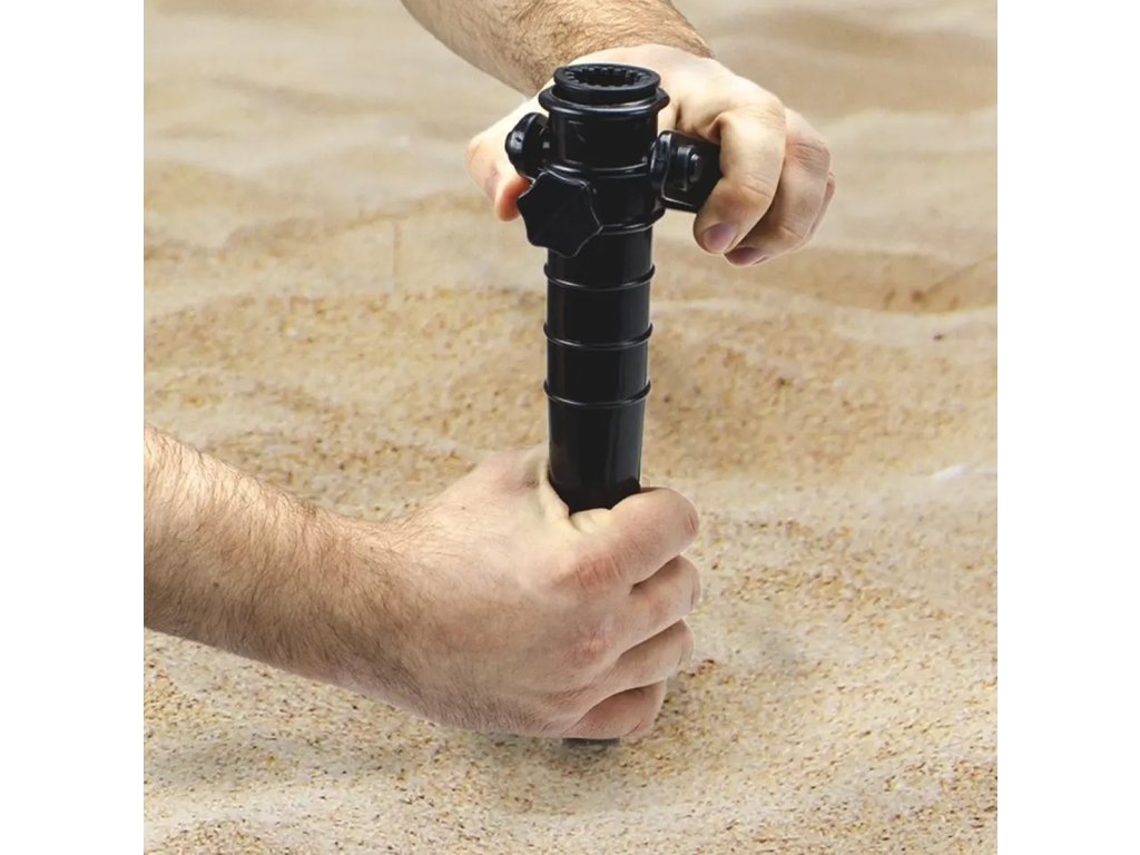 Kompaktní stojan na slunečník. Vybaveno pohodlnou rukojetí a spirálovým hrotem vrtáku, který výrazně usnadňuje šroubování do základny. Přídavná rukojeť umožňuje rychle vytáhnout rukojeť ze země. Speciální boční šroub umožňuje pevné přitlačení tyče deštníku. Držák umožňuje namontovat deštník o průměru tyče až 35 mm.