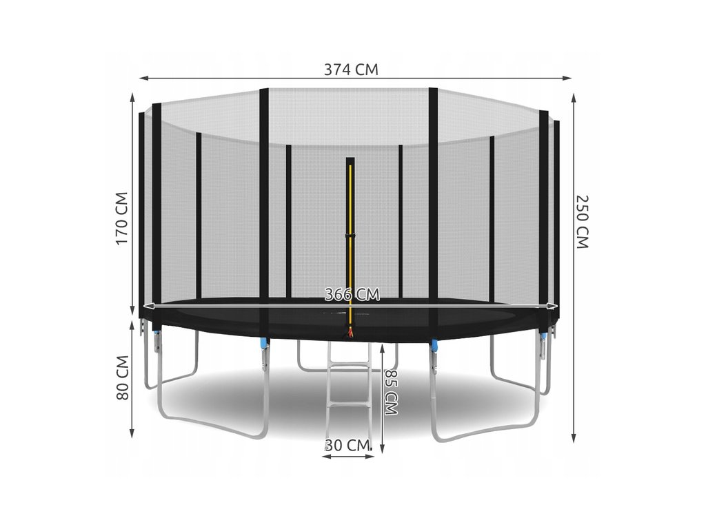 - průměr trampolíny: 366-374cm 12 stop (měřeno s tyčemi; rohož s krytem pro tyče 366cm)