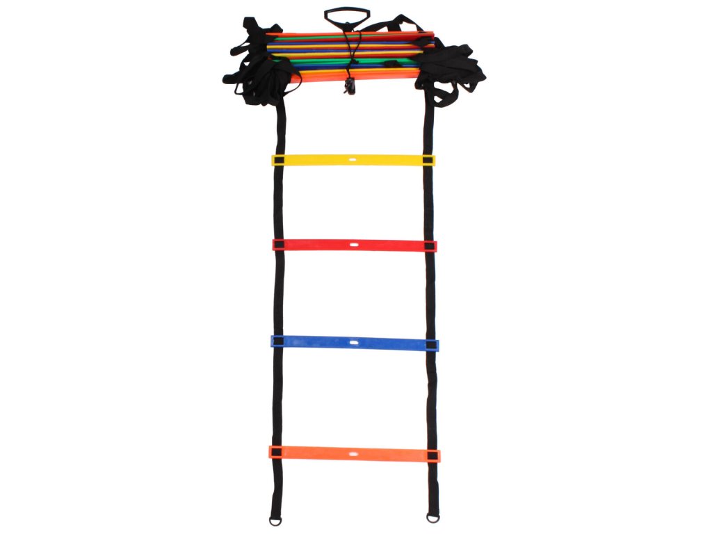 Agility žebřík Merco MultiColour je tréninková pomůcka pro kondiční přípravu sportovců. Celkem 10 plastových příček u provedení 4 m, nebo 20 plastových příček u provedení 8 m lze snadno nastavit pro přizbůsobení vzdálenosti mezi jednotlivými příčkami podle potřeb a nápaditosti uživatele. U obou variant žebříku je šířka 43 cm. Součástí agility žebříku Merco MultiColour je madlo, které se protahuje středem příček a zabraňuje zamotání žebříku + obal pro snadné uskladnění. Upozornění: Agility žebříky neslouží v žádném případě k lezení, nýbrž ke cvičení techniky a rychlosti sportovců na zemi.Doplňkové parametry